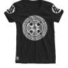 Front is large 32cm-12,5″ diameter print, back 26cm-10″ length valhalla logo with 8cm-3″ circle print on both sleeves.