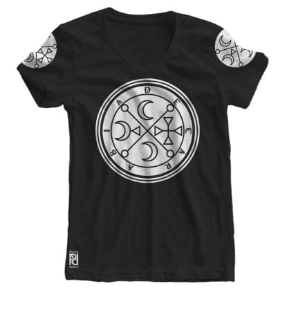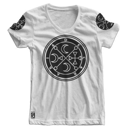 Front is large 27cm-10,5″ diameter print, back 26cm-10″ length Ars Goetia logo with 8cm-3″ circle print on both sleeves.