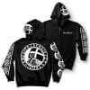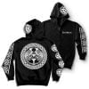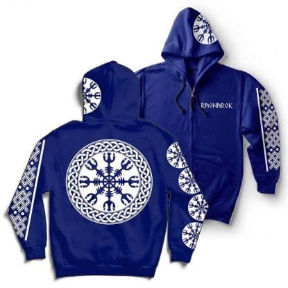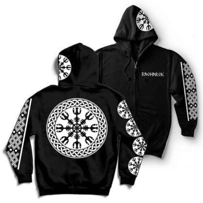 Back is large 30cm-12” diameter print, front 12cm-5” length Ragnarok logo with print on both sleeves and on hood.