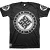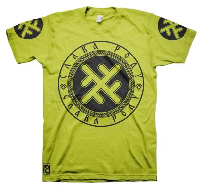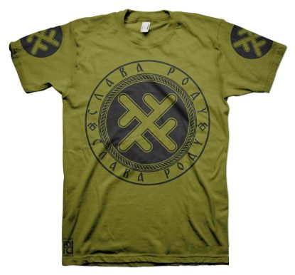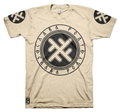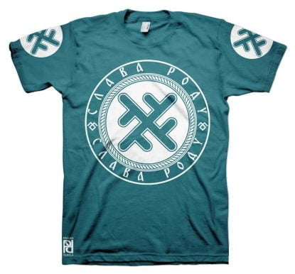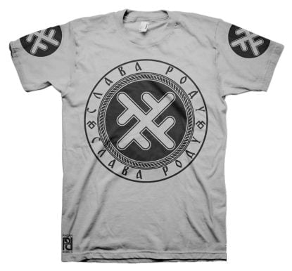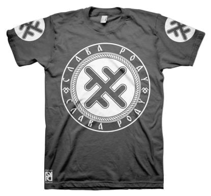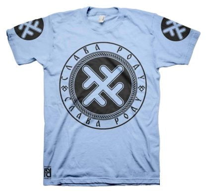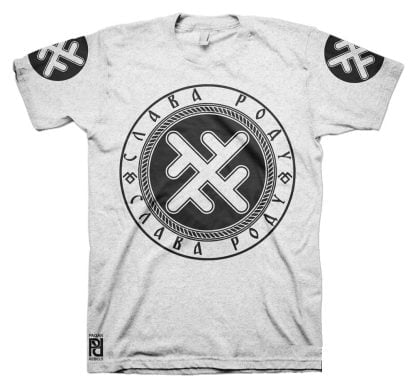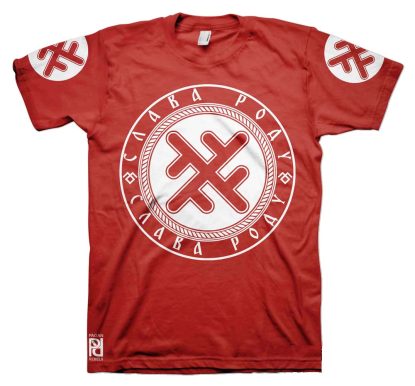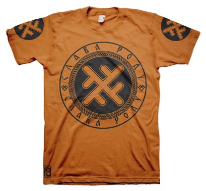 Front is large 30cm-12″ diameter print, back 30cm-12″ length Slava Rodu logo with 10cm-4″ circle print on both sleeves.