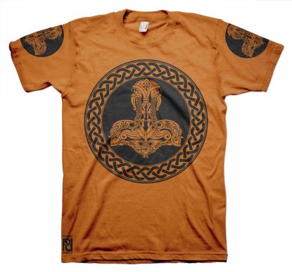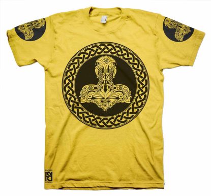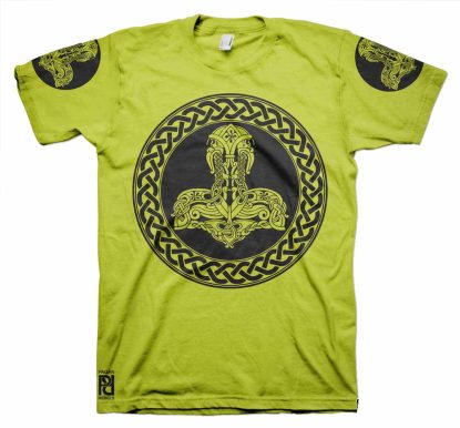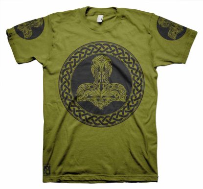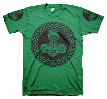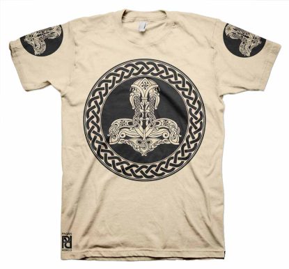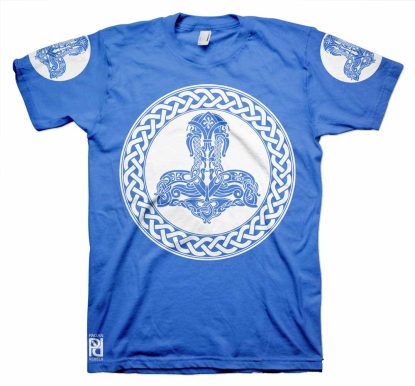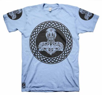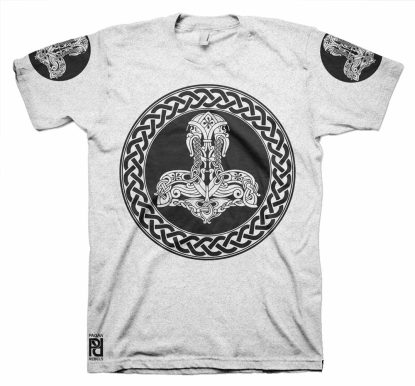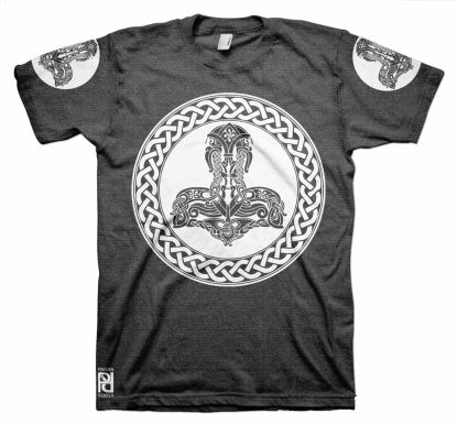 This t-shirt encapsulates an inspiring blend of ancient mythology and modern style. With its trendsetting design, it serves as a timeless piece in any wardrobe, boldly modern yet steeped in history. Embark on your own Valkyrie mission in luxe comfort as the detailed print brings the Twin Skull Thor Hammer and Norse Viking imagery vividly to life.