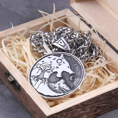 Name:Never Fade Men stainless steel Wolf head and life tree norse viking pendant necklace vikings wooden box as christmas gift